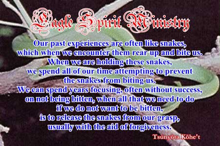 Sometimes, we seem to be surrounded by the same issues for years, decades or lifetimes. Often the issues which cause us aggravation will leave us, perhaps through our own determined action to keep the issues away from us. However, until and unless we release the issues whatever they may be, the issues will continue to return to us for time to time. If we consider the issues which continue to surround us, we will see that we seem to be holding a hand full of snakes. We are holding the snakes, which will represent experiences such as, a broken relationship, unrequited love, the passing of a loved one, financial difficulties, employment frustrations and so on at arms length, and we are attempting not to be bitten by one or more of the snakes. |