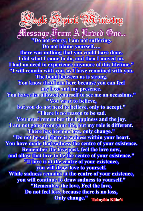 "Do not worry, I am not suffering. Do not blame yourself there was nothing that you could have done. I did what I came to do, and then I moved on. I had no need to experience anymore of this lifetime."